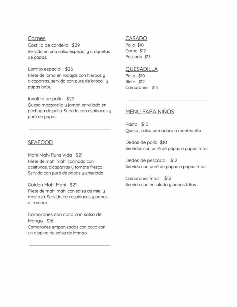 | Sea Food | Mahi Mahi Pura Vida, Golden Mahi Mahi, Coconut Shrimp in Mango Sauce |
